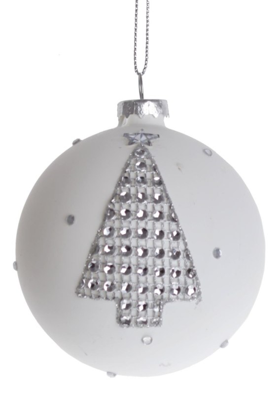 BOMBKA SZKLANA BIAŁA Z CHOINKĄ Z KRYSZTAŁKAMI