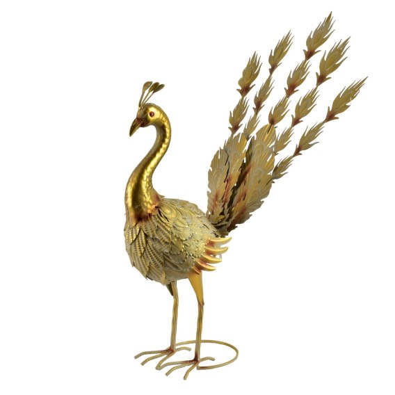 CEDRIC. Metalowa Figura PAW 583953 cm (pióra do góry) Dekoracyjna metalowa figura pawia marki CEDRIC to efektowny akcent, który wnosi do przestrzeni ogrodowej elegancję i wyrazisty charakter. Paw z uniesionymi piórami prezentuje się niezwykle dynamicznie i dekoracyjnie, symbolizując piękno, dumę i harmonię natury. Figura została wykonana z metalu i utrzymana w złotej kolorystyce, dziękiczemu doskonale komponuje się z roślinnością ogrodu, tarasu czy balkonu. Starannieopracowane detale piór nadają dekoracji lekkości oraz artystycznego wyrazu, czyniąc ją atrakcyjną ozdobą przestrzeni zewnętrznych, jak i zadaszonych wnętrz.Dzięki wymiarom 583953 cm paw jest dobrze widoczny, a jednocześnie nie przytłacza aranżacji. Idealnie sprawdzi się jako dekoracja ogrodu lub tarasu, ustawiona wśród zieleni lub jako centralny element kompozycji. Wskazówka użytkowa: Aby zachować estetyczny wygląd figury na dłużej, nie zaleca się pozostawiania pawia na zewnątrz w okresie zimowym. Na czas mrozów najlepiej przenieść dekorację do suchego, zadaszonego miejsca.CEDRIC PAW to połączenie metalowej trwałości, naturalnej kolorystyki i dekoracyjnej formy, które podkreśli charakter każdej przestrzeni wypoczynkowej.