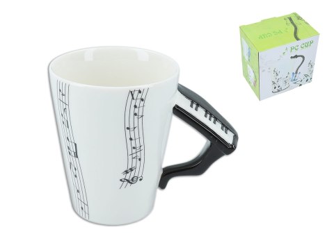 Kubeczek jest wykonany z białej porcelany, ozdobiony pięknym motywem muzycznym. Całość wykończona jest w delikatnym połysku, co sprawia, że kubeczek wygląda bardzo elegancko i atrakcyjnie. Motyw muzyczny sprawia, że jest doskonałym prezentem dla miłośników muzyki i pięknych, unikatowych przedmiotów. Ten kubeczek zdecydowanie wyróżnia się spośród innych i z pewnością zostanie doceniony przez każdego, kto go otrzyma.