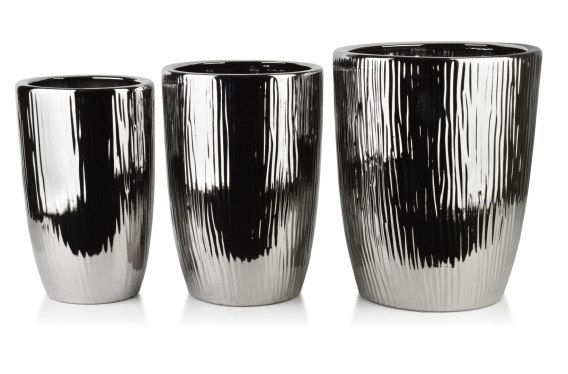 Komplet trzech osłonek ceramicznych NEVA w kolorze srebrnym to elegancki zestaw, który łączy nowoczesny design z wyrafinowanym blaskiem metalicznego wykończenia. Każda z osłonek wykonana jest z wysokiej jakości ceramiki, co gwarantuje trwałość, stabilność oraz odporność na uszkodzenia. Ich powierzchnia pokryta została lśniącą, srebrzystą glazurą, która pięknie odbija światło, nadając wnętrzu luksusowy i efektowny charakter.Zestaw obejmuje trzy osłonki o wymiarach 37x37x47 cm, 30x30x43 cm oraz 24x24x40 cm, dzięki czemu można stworzyć harmonijną, wielopoziomową kompozycję roślinną lub wykorzystać je oddzielnie w różnych częściach pomieszczenia. Ich smukły kształt i elegancka forma sprawiają, że doskonale prezentują się zarówno w nowoczesnych, jak i klasycznych aranżacjach wnętrz.Komplet NEVA w kolorze srebrnym to doskonały wybór dla osób ceniących styl, prostotę i blask. Osłonki te stanowią wyjątkową dekorację, która podkreśla piękno roślin i dodaje przestrzeni elegancji. Idealnie sprawdzą się w salonie, holu czy biurze, wprowadzając do wnętrza subtelny, nowoczesny akcent o ponadczasowym charakterze.