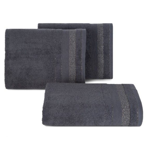 Ręcznik bawełniany z żakardową bordiurą z błyszczącą nicią szerokość: 50 cm, długość: 90 cm, kolor: grafitowy, Gramatura: 500 GSM, Skład: 100% bawełna; część ozdobna: 95% bawełna, 5% poliester