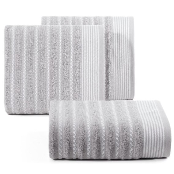 Ręcznik z ozdobną bordiurą w pasy szerokość: 70 cm, długość: 140 cm, kolor: srebrny, Gramatura: 450 GSM, Skład: 100% bawełna; część ozdobna: 97.5% bawełna, 2.5% poliester