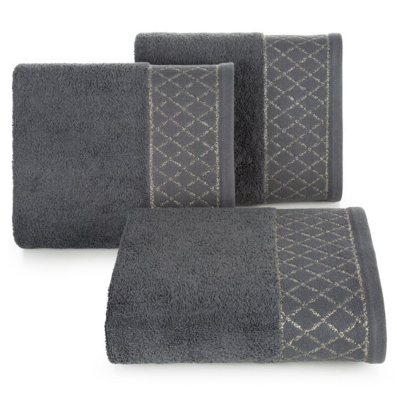 Ręcznik bawełniany z ozdobną bordiurą i błyszczącą nicią szerokość: 30 cm, długość: 50 cm, kolor: stalowy, Gramatura: 500 GSM, Skład: 100% bawełna; część ozdobna: 50% bawełna, 50% poliester
