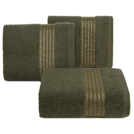 Ręcznik bawełniany z ozdobną bordiurą i błyszczącą nicią szerokość: 50 cm, długość: 90 cm, kolor: oliwkowy, Gramatura: 500 GSM, Skład: 100% bawełna; część ozdobna: 50% bawełna, 50% poliester