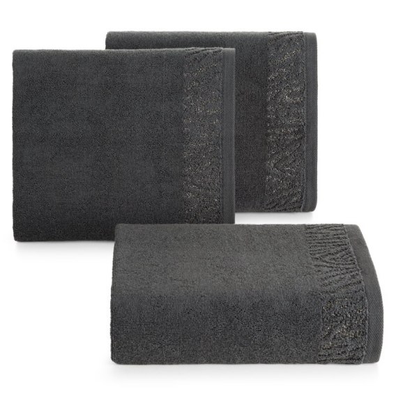 Ręcznik bawełniany z ozdobną bordiurą przetykaną błyszczącą nicią szerokość: 30 cm, długość: 50 cm, kolor: stalowy, Gramatura: 500 GSM, Skład: 100% bawełna; część ozdobna: 50% bawełna, 50% poliester