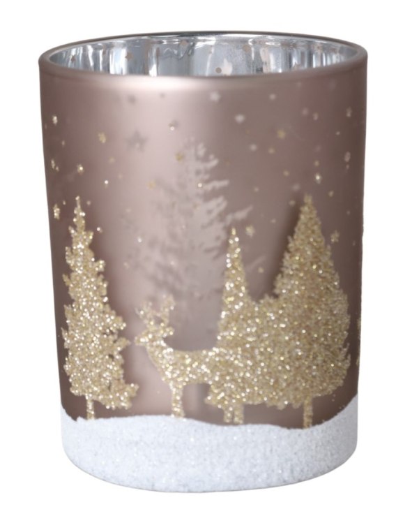 ŚWIECZNIK SZKLANY BRĄZOWY Z CHOINKAMI MAŁY